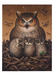 I paint mainly on raw birch panels and cut out shapes of birch plywood. The texture and the grain of the wood that shows through the transparent layers of paint, makes it’s own statement as the fingerprint of it’s natural origins that persist beyond the transformation from tree to painted surface.